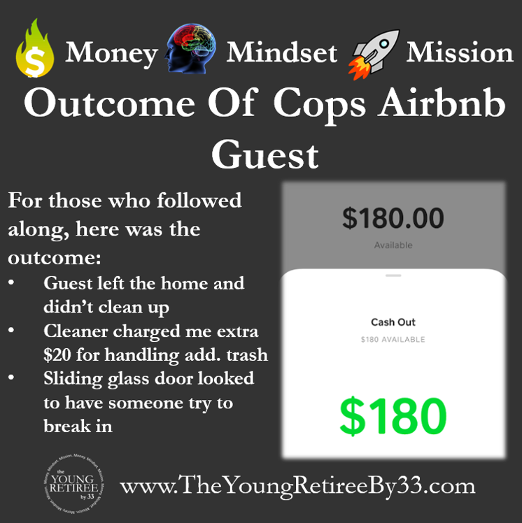 I can now say I have had to deal with the cops being at one of my properties. All in all, I am glad my property wasn’t completely damaged and the guest wasn’t harmed (at least from what she is telling me).